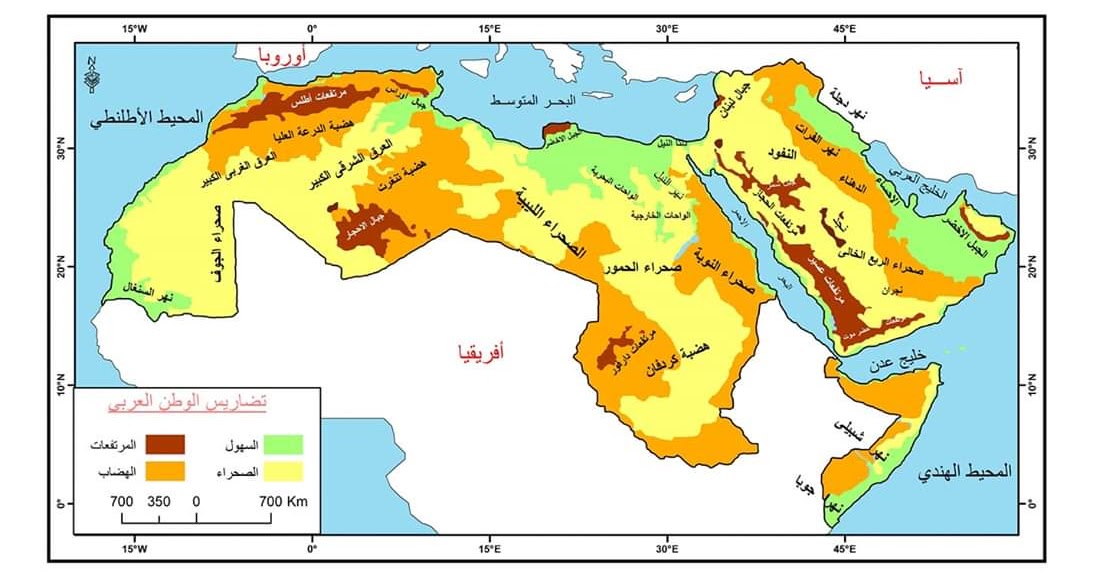 تضاريس خريطة الوطن العربي الطبيعية. المنطقة من ساحل عمان إلى ساحل محيط الأطلنطي أصنف المظاهر التضاريسية الوارد في الشكل إلى ثلاث أقسام جبال هضاب سهول. يعرف الوطن العربي بأنه المنطقة الجغرافي ة التاريخي ة الممتدة من المحيط الأطلسي في الجهة الغربي ة إلى بحر العرب والخليج العربي في الجهة الشرقي ة ويتضمن جميع الدول التي تنتمي إلى جامعة الدول. خريطة التضاريس في الوطن العربي. إن من اهم ما ندرسه في الوطن العربي تضاريسه والتي تمثل حدودا طبيعية بينه وبين الدول المجاورة او بين دوله الشقيقه إن للتضاريس تأثيرا كبيرا في.