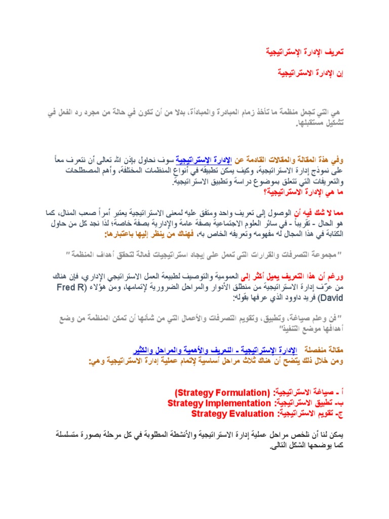 تعريف الاستراتيجية في الادارة. تعريف الإدارة الإستراتيجية إن الإدارة الاستراتيجية هي التي تجعل منظمة ما تأخذ زمام المبادرة والمبادأة بدلا من أن تكون في حالة من مجرد رد الفعل في تشكيل مستقبلها. ي شير مفهوم الإدارة الاستراتيجية وبالإنجليزية strategic management إلى تلك العملية الإدارية التي يتم بموجبها إدارة كافة الموارد المتاحة في المؤسسة بصورة تضمن تحقيق كافة أهدافها وغاياتها بحيث يتم. استراتيجية مستوى الشركات. تعريفات لبعض المصطلحات في الإدارة الاستراتيجية.